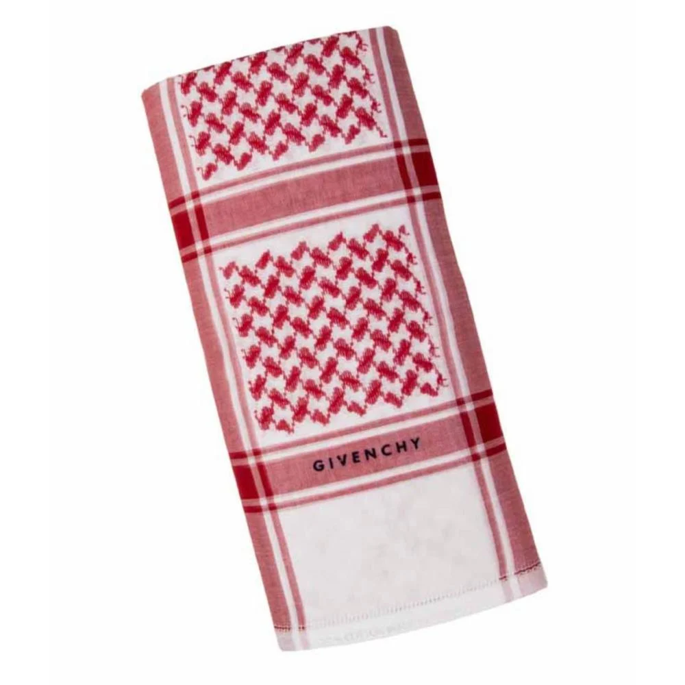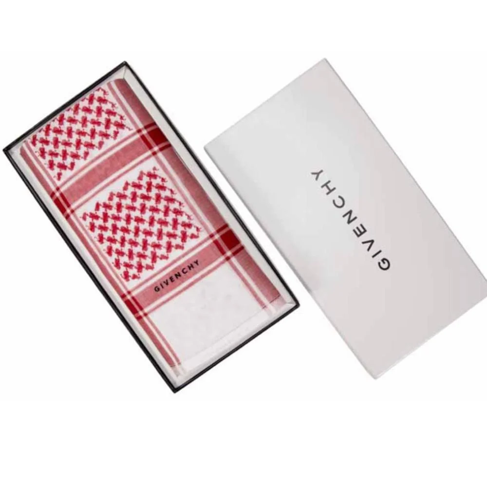 - الحواف والتفاصيل: تكون حواف الشماغ مطرزة بدقة عالية، مما يضيف لمسة من الفخامة والأناقة. كما يمكن أن يحمل الشماغ شعار جيفنشي الشهير بطريقةٍ متقنة على إحدى الحواف، مما يزيد من قيمته الجمالية.