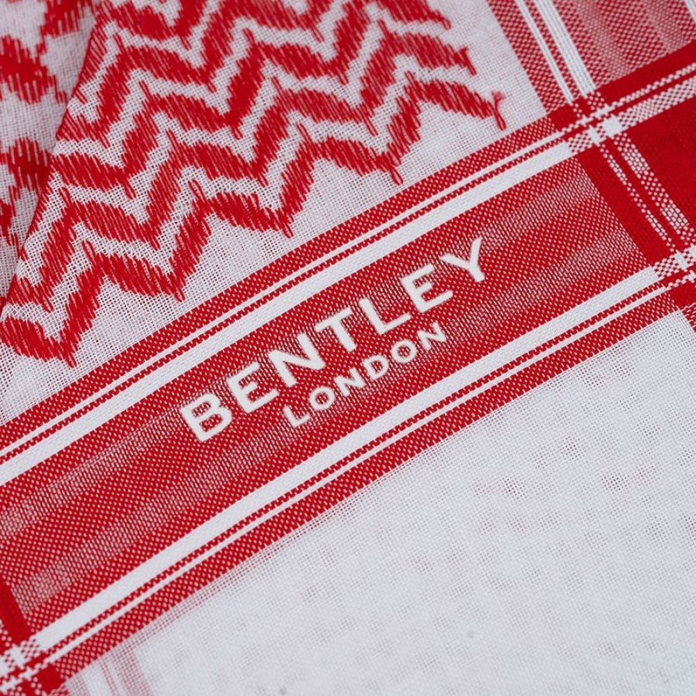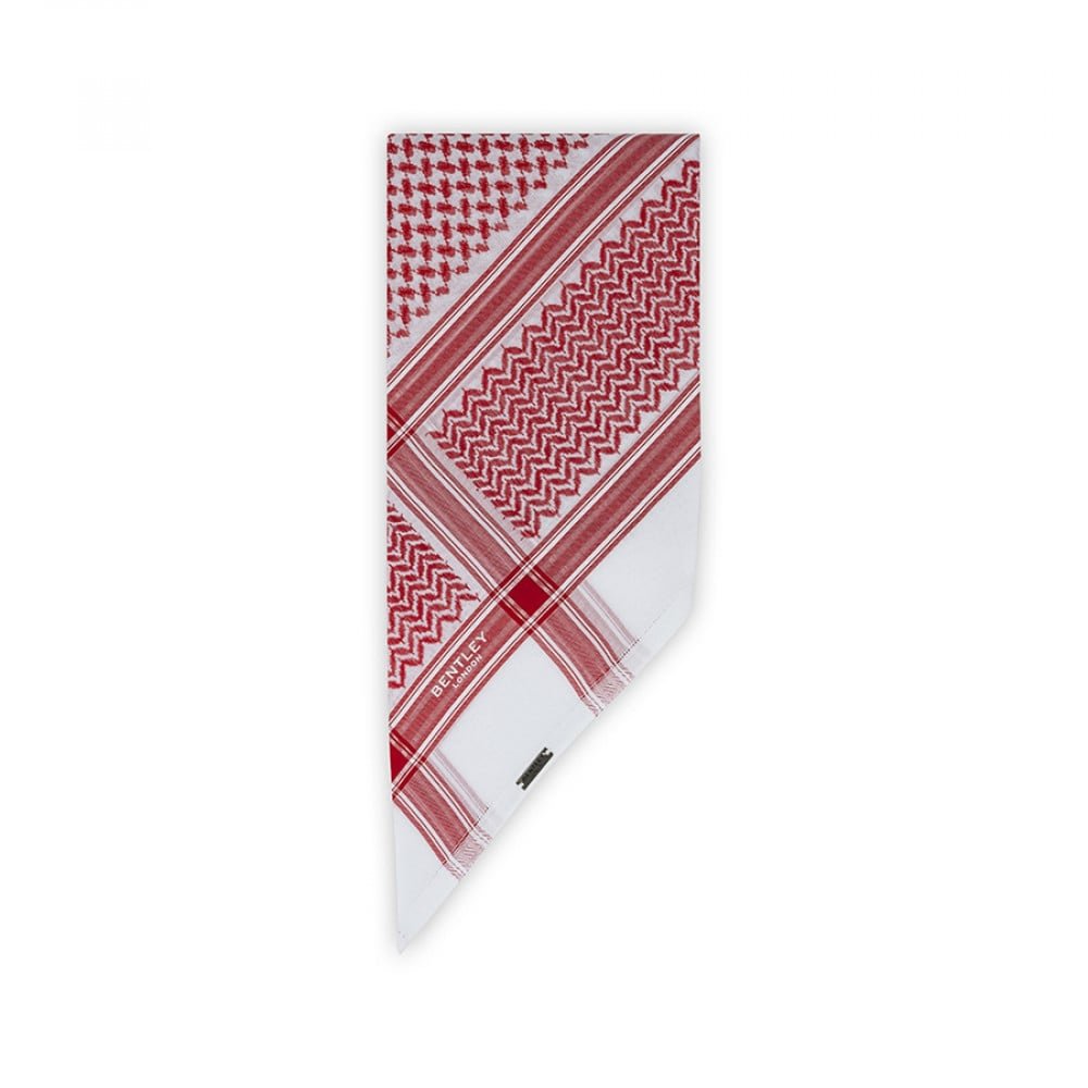 * الاسم مكتوب بتباين و انسجام مع الشماغ باللون الابيض و علامة معدنية مطبوع عليها ماركة BENTLEY.