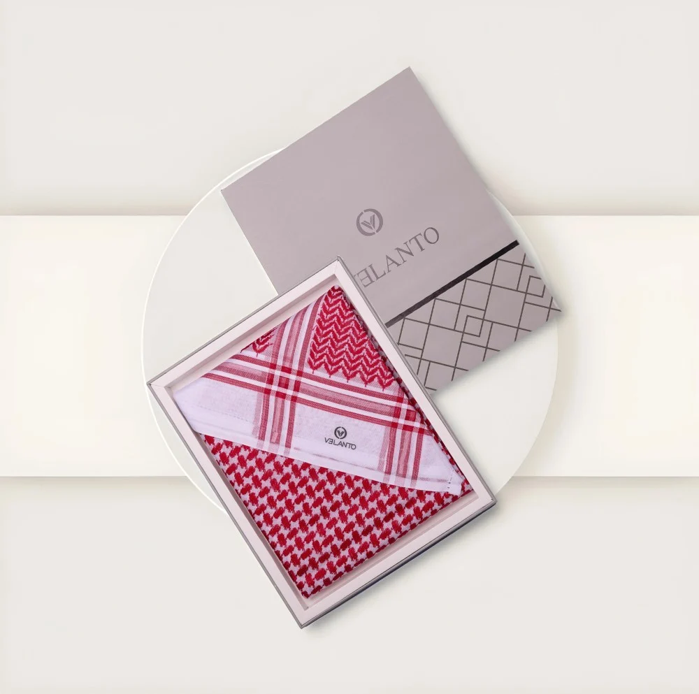 انضم إلى عالم الأناقة والفخامة مع شماغ فلانتو VELANTO الاصدار الجديد باللون الأحمر الغامق، واجعل أسلوبك يتباهى بالتميز والأناقة.”
